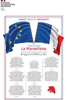 Dans le cadre des mesures issues de la loi pour une École de la confiance, le ministère met à disposition des écoles, collèges et lycées, une affiche représentant les drapeaux français et européen, la devise de la République et l'hymne national afin que chaque classe puisse en disposer et l'afficher.