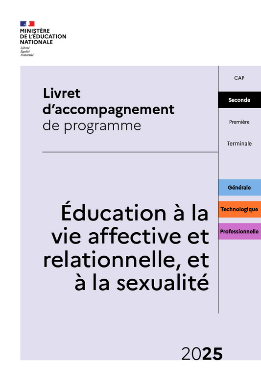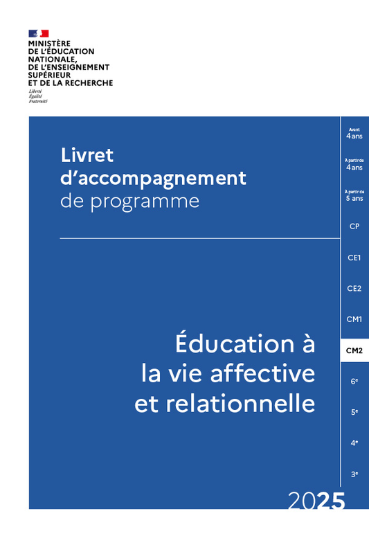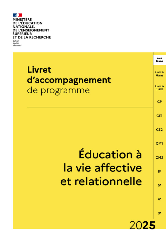 Afin d'accompagner les équipes des écoles et établissements scolaires dans la mise en œuvre des programmes d’éducation à la vie affective et relationnelle dans le premier degré et d’éducation à la vie affective et relationnelle, et à la sexualité dans le second degré dès la rentrée 2025, cette page met à leur disposition le programme, des livrets pédagogiques, des repères, une foire aux questions ainsi que des documents de communication à destination des familles.