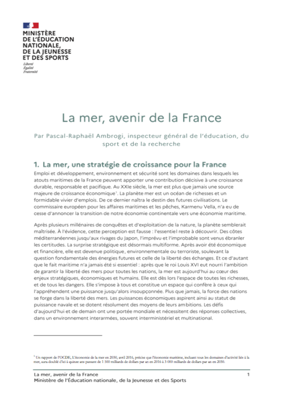 Emploi et développement, environnement et sécurité sont les domaines dans lesquels les atouts maritimes de la France peuvent apporter une contribution décisive à une croissance durable, responsable et pacifique. Au XXIe siècle, la mer est plus que jamais une source majeure de croissance économique. La planète mer est un océan de richesses et un formidable vivier d'emplois.