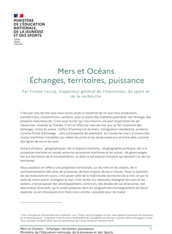 L'étude des mers et des océans couvre des enjeux géographiques, liés à l'espace maritime, de géographie politique, liés à la puissance maritime et navale, entre les puissances maritimes et les autres, de géostratégie, liés aux territoires de la mondialisation, et donc à cet espace maritime qui devient l'un de ces territoires.