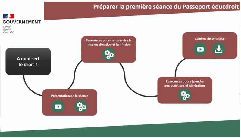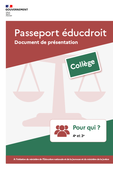 Le Passeport éducdroit est un dispositif d’éducation au droit et à la citoyenneté, élaboré conjointement par le ministère de la justice et le ministère chargé de l’éducation nationale. À destination des classes de cycle 4, le passeport comprend trois séances de deux heures. Des parcours au choix permettent de travailler un thème précis sous l’angle juridique.
