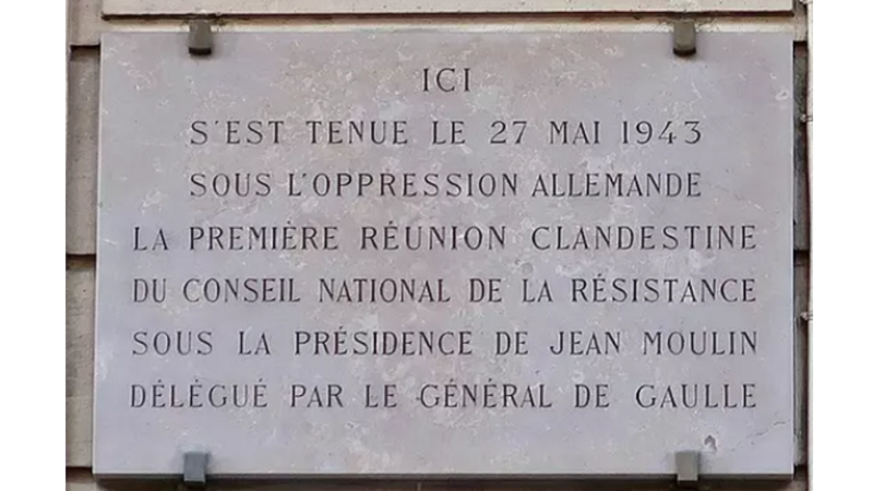 Plaque située au 48 rue du Four (Paris, 6e) pour commémorer la première réunion clandestine du Conseil de la Résistance le 27 mai 1943. « Ici s’est tenue le 27 mai 1943 sous l’oppression allemande la première réunion du Conseil national de la Résistance sous la présidence de Jean Moulin délégué par le général de Gaulle »