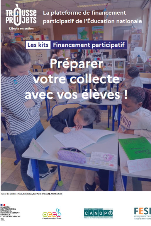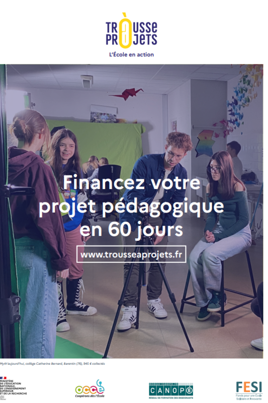 Avec la Trousse à projets, réalisez vos projets éducatifs et pédagogiques grâce au financement participatif. Pour ce faire, le ministère chargé de l'éducation nationale s'associe à l'Office central de la coopération à l'école (OCCE), à réseau Canopé, au Crédit coopératif et au Fonds pour une École Solidaire et Innovante (FESI).