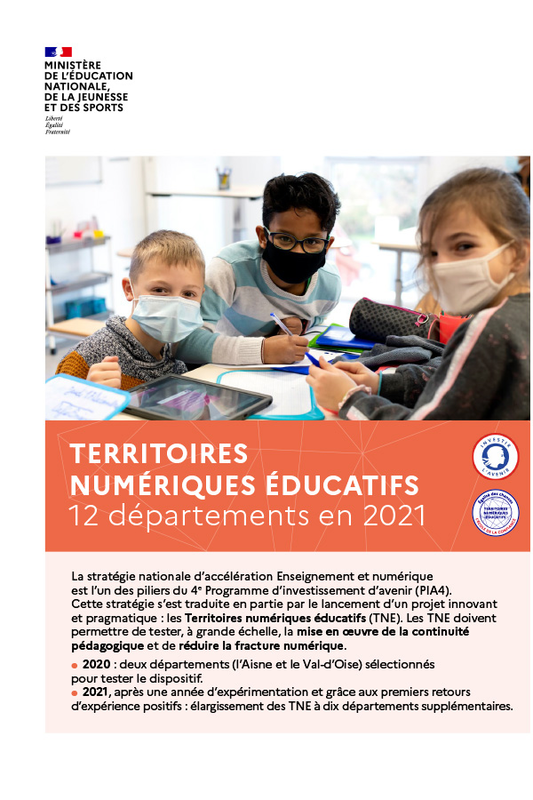 L’action Territoires numériques éducatifs, par un premier démonstrateur sur les départements de l’Aisne et du Val d’Oise et l'ajout de 10 nouveaux départements (Bouches-du-Rhône, Cher, Corse du Sud, Doubs, Finistère, Guadeloupe, Hérault, Isère, Vienne, Vosges) à la rentrée 2021, vise à tester à grande échelle une mise en œuvre de la continuité pédagogique (en classe et à distance) grâce au numérique éducatif en agissant dès l’école primaire.
