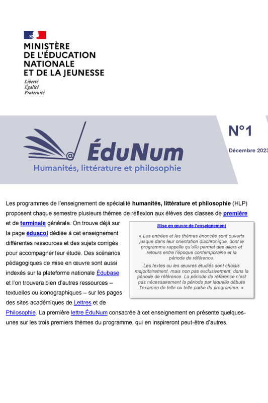 La lettre ÉduNum Humanités, Littérature et Philosophie n°1 recense un certain nombre de scénarios pédagogiques en lien avec les différents thèmes de cet enseignement de spécialité en classes de première et de terminale. Co-écrite par des professeurs des deux disciplines, elle présente à part égale les contributions de chacune d’elles à ce co-enseignement.