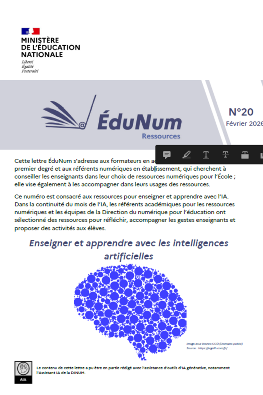 La Lettre ÉduNum Ressources n°20 - février 2026 est consacré aux ressources pour enseigner et apprendre avec l’IA. Dans la continuité du mois de l’IA, les référents académiques pour les ressources numériques et les équipes de la Direction du numérique pour l’éducation ont sélectionné des ressources pour réfléchir, accompagner les gestes enseignants et proposer des activités aux élèves.