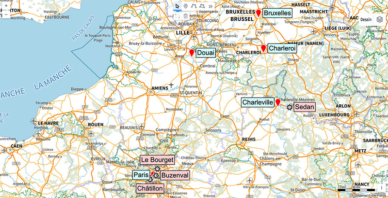 Édugéo permet également de matérialiser les villes fréquentées par Rimbaud à l’époque de la rédaction des Cahiers de Douai (principalement Charleville, Paris, Douai, Bruxelles et Charleroi), ainsi que les lieux importants du conflit franco-prussien de 1870 (bataille de Sedan, siège de Paris).