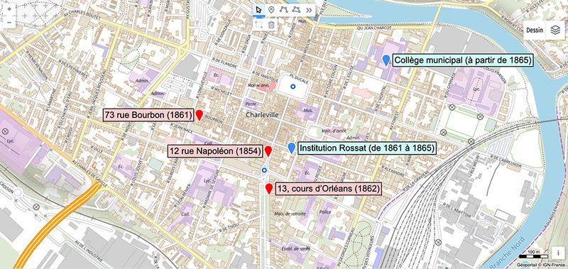 Il est naturellement possible d’identifier, à l’intérieur de chaque ville, les lieux où il a vécu. À Charleville, sa ville natale, voici ce que l’on obtient à l’époque des Cahiers de Douai.