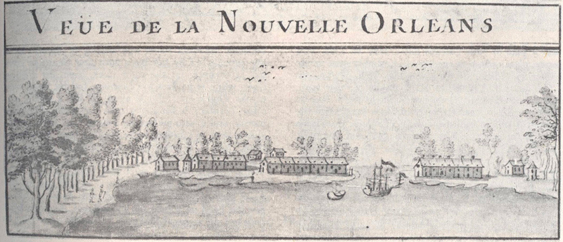 Image issue du livre "New Orleans A Pictorial History" de Leonard V. Huber, 1971, Bonanza Books. La plus ancienne représentation publiée de La Nouvelle-Orléans, datant de 1720, figurait comme ornement sur une carte française. Il est clair qu'il ne s'agit pas d'une représentation de la jeune ville sur le Mississippi. Elle pourrait en réalité représenter le premier établissement français à l'embouchure du Bayou Saint-Jean (aujourd'hui situé dans la ville, mais à l'époque à plus de 3 kilomètres de celle-ci).
